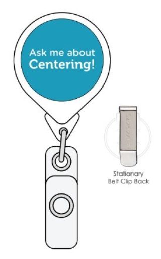 Rep your love for Centering with our jumbo retractable badge reel! Featuring the text "Ask me about Centering", this is a simple way to boost recruitment efforts and show your commitment to transforming healthcare for all!